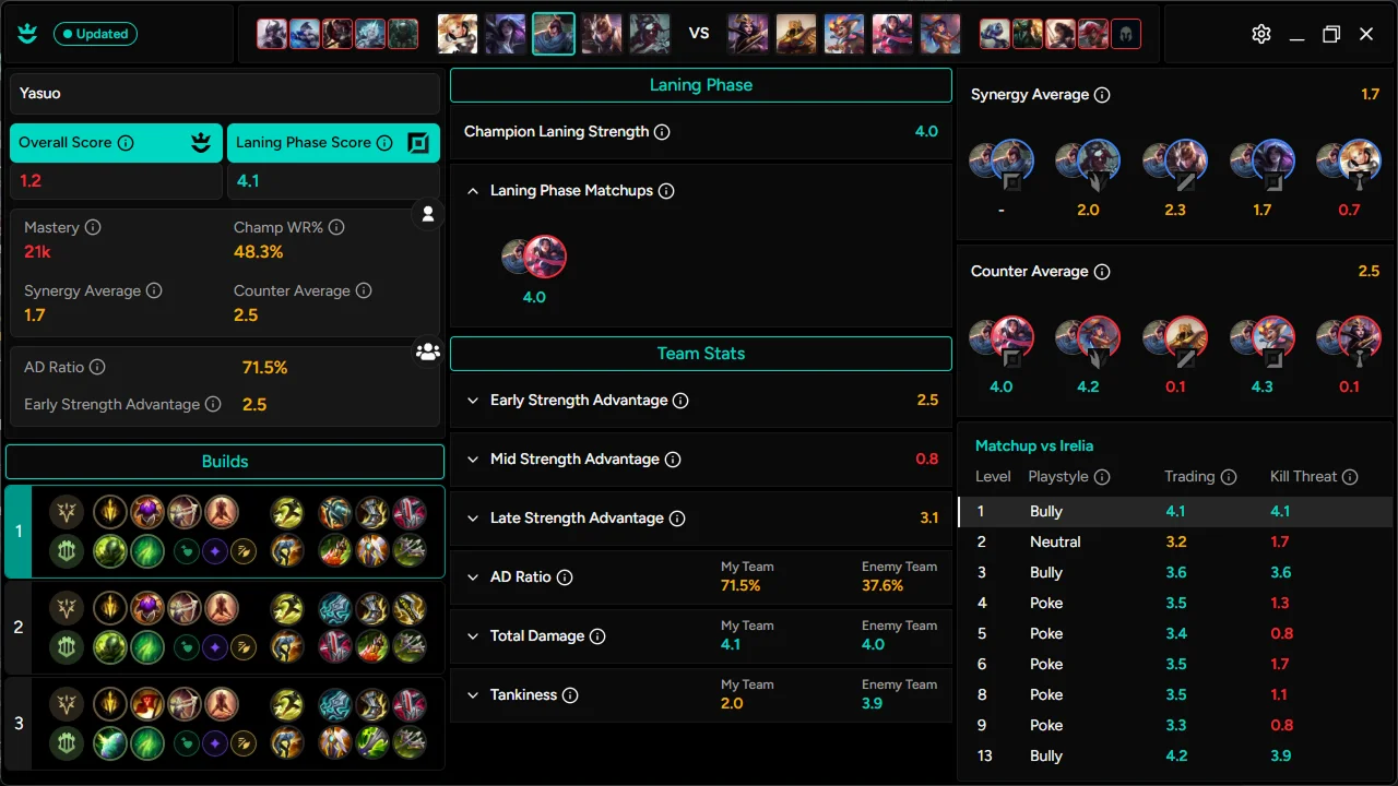 Next level application, it seems like every patch the quality of this app gets better and better. Ever since downloading this application there was no need to use any others anymore since they give draft tips and the build and runes are shown too which you can implement with 1 simple click. During the game it even gives information what kind of playstyle you need to use at each level which can give a whole other insight in certain matchups. Great community in the discord server too that's very helpful and responds quick whenever someone has a question. the team is open too suggestions too and brings a wholesome vibe.
